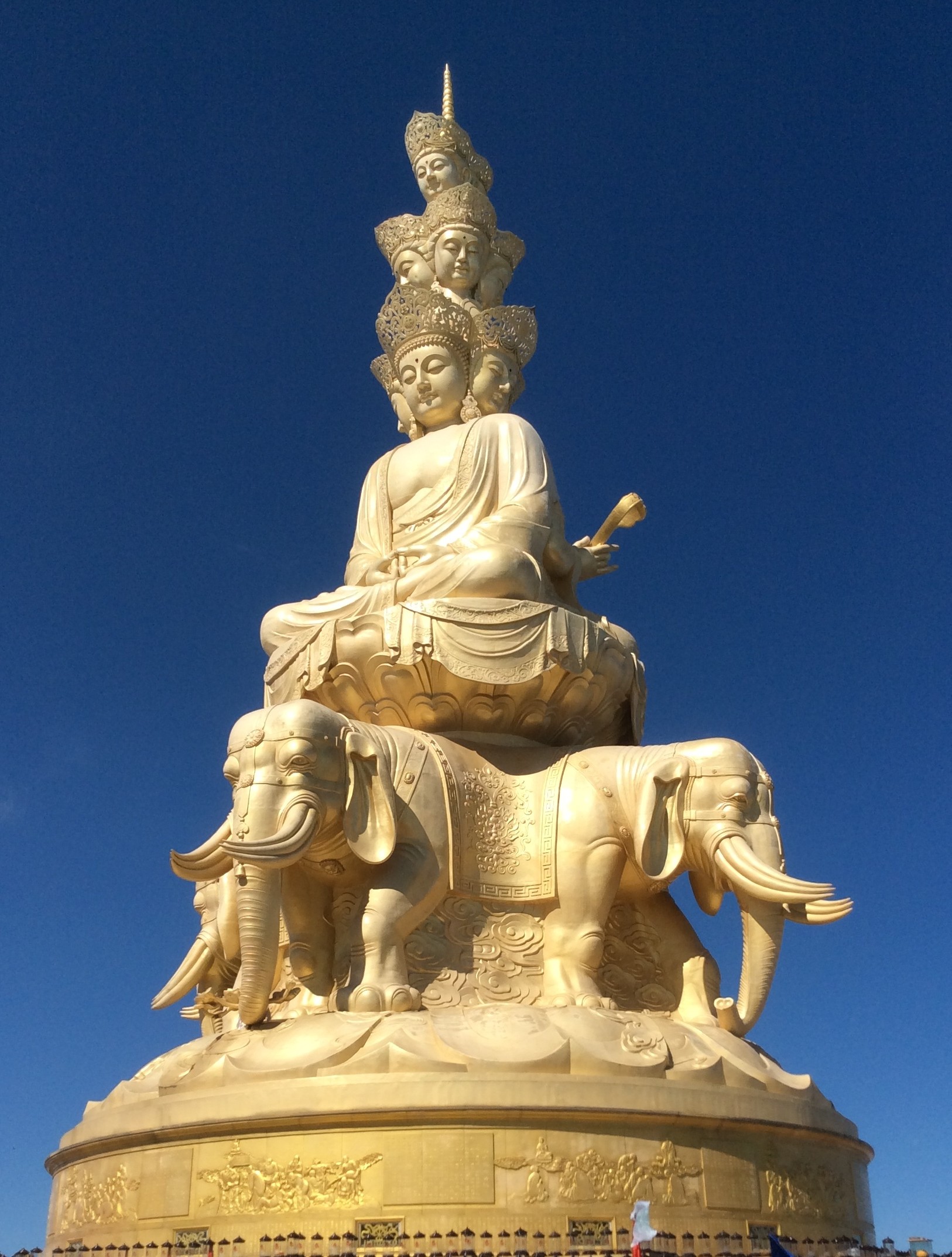 Après avoir monté les dernières marches, on peut admirer la grande statue dorée représentant Samantabhadra avec ses nombreuses têtes, assis sur quatre éléphants. Le mont Emei est consacré à ce grand bodhisattva. Il y a quatre grands bodhisattvas en Chine : la pratique (Samantabhadra), la sagesse (Mañjuśrī), la compassion (Avalokiteśvara) et le vœu (Ksitigarbha). Ils désignent les quatre conditions nécessaires pour devenir bodhisattva (le bodhisattva est une personne ayant fait vœu de suivre le chemin de Bouddha pour aller vers l’éveil). Chacune des quatre montagnes sacrées de Chine est associée à un des quatre grands bodhisattvas.